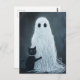 Eine lustige Halloween-Szene mit einem Geist voller Garne und einer Katze, die ihn umarmt