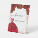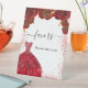 Ein Gastgeschenk-Schild. Ein weißer Hintergrund mit roten Imitaten Glitzer Glitzern, ein rotes Kleid und rote Rosen, Blumenmuster.