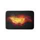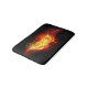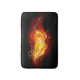 Helle Pfauenfeder aus Feuer und Flamme auf schwarzem Hintergrund.