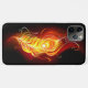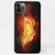Helle Pfauenfeder aus Feuer und Flamme auf schwarzem Hintergrund.