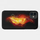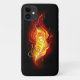 Helle Pfauenfeder aus Feuer und Flamme auf schwarzem Hintergrund.