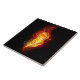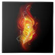 Helle Pfauenfeder aus Feuer und Flamme auf schwarzem Hintergrund.