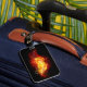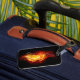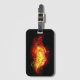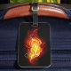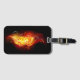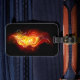 Helle Pfauenfeder aus Feuer und Flamme auf schwarzem Hintergrund.