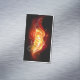 Helle Pfauenfeder aus Feuer und Flamme auf schwarzem Hintergrund.