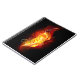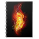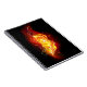 Helle Pfauenfeder aus Feuer und Flamme auf schwarzem Hintergrund.