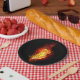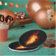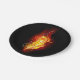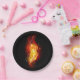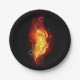 Helle Pfauenfeder aus Feuer und Flamme auf schwarzem Hintergrund.