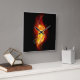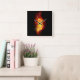 Helle Pfauenfeder aus Feuer und Flamme auf schwarzem Hintergrund.