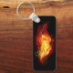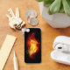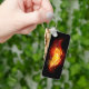 Helle Pfauenfeder aus Feuer und Flamme auf schwarzem Hintergrund.
