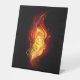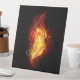 Helle Pfauenfeder aus Feuer und Flamme auf schwarzem Hintergrund.