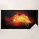 Helle Pfauenfeder aus Feuer und Flamme auf schwarzem Hintergrund.