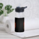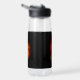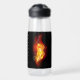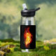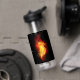 Helle Pfauenfeder aus Feuer und Flamme auf schwarzem Hintergrund.