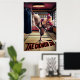 Ein Comedian-Poster mit einem Cartoon-Hühnchen, das Boxhandschuhe trägt und eine Stanztasche mit Entschlossenheit energisch kickt.