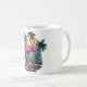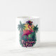 Genießen Sie Ihre Lieblingsgetränke stilvoll mit dieser festlichen Tasse mit einem Flamingo, das auf einem Bein stehend ist und mit einer gekrönten Halskette und einer gefederten Mardi Gras-Maske geschmückt ist. Set vor einem tropischen Hintergrund mit Palmen und einem goldenen Sonnenuntergang, dieses Design bringt die lebendige Energie des Karnevals zu Ihrem Kaffee oder Tee Pausen. Ideal für Party-Liebhaber und Liebhaber von tropischen Farben.