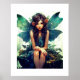 Eine Waldfee, die auf einem Baumstamm im Regen sitzt. Fantasy-Waldmärchen-Poster.