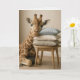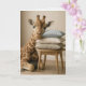 A tired giraffe leans against a stack of pillows on a wooden table, basking in the warm glow of sunlight that filters through a nearby window.