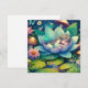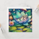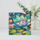 Niedliche Fee, die auf einer Lotus-Blume auf einem Lilienpolster mit Blume und Pilzhintergrund schläft. Niedliche Märchenstil-Illustration. Leere Karte.