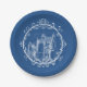 Ein großes Vintages Schloss der feenhaften Geschichte in einem hübschen Vintagen Rahmen im Weiß auf einem reichen blauen Hintergrund oder irgendwelchen, die zur mittleren Farbe Ihrer Wahl dunkel sind, machen einen Spaß und reizendes ein Fantasie-Party Papierplatte. Zusammenpassende Einzelteile sind in meinem Zazzle Speicher verfügbar.