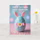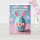 Diese Karte zeigt ein glattes, blaugrünes, eiförmiges Zentrum, das mit aufrecht stehenden Hasenohren versehen ist, die weiß gespitzt und weich mit Rosa ausgekleidet sind 🐰. Winzige, bonbonartige Punkte und kleine Sternformen in hellrosa, weiß und buttergelb sind über die Oberfläche gestreut und verleihen ihr ein süßes, gesprenkeltes Aussehen. Ein glänzendes rosa Band umwickelt die Mitte und ist zu einer sauberen Schleife gebunden, was eine sanfte, geschenkartige Geste zwischen engen Freunden andeutet. In die Schleife ist eine weiße Margerite mit goldenem Zentrum gesteckt, wie eine kleine, blumige Notiz, die mit stiller Zuneigung hinterlassen wurde 🌷. Entlang des unteren Randes sind einige runde, pastellfarbene Süßigkeiten auf einer rosa Oberfläche verstreut, die dieselbe weiche Farbpalette widerspiegeln. Der Hintergrund verblasst nach oben hin zu einem hellen Himmelblau mit großen, weich verschwommenen Kreisen