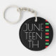 Ein Schlüsselanhänger zur Feier im Juni. Der Schlüsselanhänger ist rot, schwarz und grün, der Hintergrund schwarz mit weißen Buchstaben.