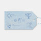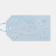 Das hellblaue und weiße Design hat ein frostiges, strukturiertes Aussehen. Der Text lautet "Happy Hanukkah" auf der einen Seite und "To" und "From" auf der anderen Seite. Zu den Grafiken zählen Star of David, Menorah, dreidel, zehn Gebot-Tablets, Schneeflocken und ein Schneemann.