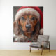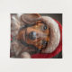 Das Bild zeigt eine bezaubernde Dackel in festlicher Kleidung mit einem roten Hut des Weihnachtsmannes mit flauschigen weißen Zierteilen. Die großen, ausdrucksstarken Augen und die glänzende schwarze Nase bilden den Mittelpunkt der nah-up-Szene und sorgen für ein herzliches und charmantes Urlaubsatmotiv. Die Dackel trägt auch ein gemütliches, rotes Outfit mit einem Imitat Pelzkragen, was die festliche und warme Atmosphäre der Szene noch verstärkt.