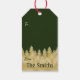 Elegante Geschenkmarke mit dunkelgrünem Hintergrund und Imitaten goldgelben Pinienwald Silhouette.