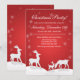 Feierliche Einladung zur Kollektion Weißer Rentier und Schneeflocken. Eine Familie weißer Rentiere vererbt auf schneebedeckten Hügeln, während knusprige Schneeflocken auf sie herabschweben. Ein roter Hintergrund verleiht dem Design ein warmes, festliches Ambiente. Ideal für Kinder oder die Kinder im Herzen!