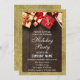 Feierliche Weihnachtsfeiertagsgesellschaft Weihnachten Party Einladung mit funkelnd goldfarbenem Glitzer Glitzern-Rand, roten Geschenken mit Bögen und elegantem Weiß auf rustikalem dunkelbraunem Holz. Dies ist die perfekte Urlaubs-/Weihnachts-/Wintereinladung!