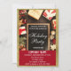 Feierliche Weihnachtsfeiertagsgesellschaft Weihnachtsfeiertage mit einer funkelnd goldenen Glitzer-Glitzern-Grenze und roten Geschenken mit Bögen rund um eine schwarze Tafel auf rustikal braunem Holz. Die Details des Party sind in Weiß mit einem hellroten Hintergrund geschrieben. Dies ist die perfekte Urlaubs-/Weihnachts-/Wintereinladung!