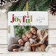Ein Weihnachtsschmuck im Foto mit dem Wort "fröhlich" in einem spielerischen Text und festlichen Farben. Das Design bietet Platz für ein Foto auf der Vorderseite und ein anderes auf der Rückseite.