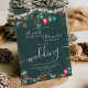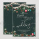 Moderne, schicke und elegante Hochzeitsfeiertage beleuchten grüne Kiefernäste Schnee mit niedlicher Illustration von Weihnachtsbällen im Glitzer, grüne Kiefernäste, Misteloe, Kiefernkegel, Saitenleuchten auf bearbeitbarem dunkelgrünem Hintergrund.
