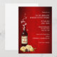 Eine elegante und auffällige Illustration einer roten Weinflasche, in der Käse, Rosmarin und dekadente Trüffelschokolade in einem rot verbrannten Set in Scheiben geschnitten sind. Eine Weihnachtsgarnlandschaft, die sich oben auf dem Weinetikett und den glitzernden Sternen befindet, reicht von der Spitze des Auslaufs aus.