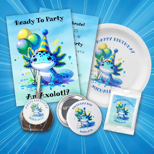 Blauer und grüner Axolotl Themenboy zum Geburtstag Einladungen. Ein niedlicher axolotl in einem Geburtstagshut mit Ballons.