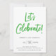 Modernes Drehbuch Let's Celebrate!, Geburtstagsfeier Einladung. Designvorlage für grüne und schwarze Typografie. Die Rückseite der Karte zeichnet sich durch ein cooles Retro-Sonnenburstmuster aus, das die grünen Farben koordiniert.