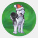 Feiernder Husky in Weihnachtsmannmütze auf Green Runder Aufkleber