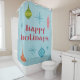 Ein modernes, inspiriertes Weihnachtsdesign mit bunten Weihnachtsbaumschmuck und Sputnik-Sternexplosionen vor einem hellblauen Hintergrund.