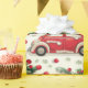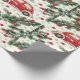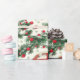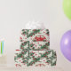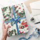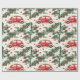 Das festliche Verpackungspapier zeigt ein Vintages rotes Auto, umgeben von Kiefernästen und leuchtend roten Ornamenten, und schafft eine fröhliche Atmosphäre, die perfekt für Feierlichkeiten mit Geschenken ist.