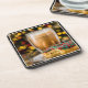 Kaffee in einer klaren Schale mit einem glasig-glänzenden Krapfen der Schokolade mit Rot u. Grün besprüht, Weihnachtslichter im Hintergrund