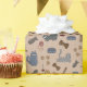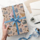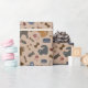 Dieses skurrile Design zeigt Cartoon-Katzen in verschiedenen Posen, umgeben von Pfotenabzügen, Garnbällen, Fischknochen, Katzenspielzeug, Lebensmittelschalen und Knochen auf hellbraunem Hintergrund. Ideal für Kinder, bietet dieses Packpapier jedem Geschenk einen lustigen, mit einem Thema versehenen Charme.