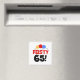 Three primary colors balloons and black and text that reads "Feisty 65" on a magnet.