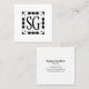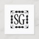 Eine quadratische Visitenkartenvorlage mit Initialen in einem quadratischen Feld mit einem dekorativen Rahmen. In dieser Version befinden sich die Initialen im fett formatierten Schriftart Integrity. Name und Beruf/Berufsbezeichnung sowie Telefon-, E-Mail- und Website-Adresse in schwarz auf der Rückseite auf weißem Hintergrund unter Verwendung von Variationen des Matt Antique Schriftartes. Diese Vorlage ist auch ein guter Ausgangspunkt für weitere Anpassungen.