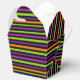Gastgeschenk Box wird mit einem Halloween Mehrfarbenstreifen-Druck auf allen Panels gezeigt. Perfekt für Halloween-Geschenke. Passen Sie dieses Objekt an oder kaufen Sie, wie es ist. Tipp: Fügen Sie einfach Ihre großen Leckereien hinzu und fügen Sie ein niedliches Halloween Band hinzu. Lizenzierte Printwerbung