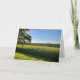Ein goldenes Feld von Sonnenblumen erstreckt sich unter einem klaren, blauen Himmel und gerahmt von üppig grünen Hügeln im Hintergrund. Die untergehende Sonne filtert durch die Bäume und strahlt warmes, bernsteinfarbenes Licht durch die Szene. Die friedliche Schönheit eines Abends im Sommer wird von der Ruhe und Gelassenheit geprägt.