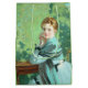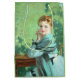 Dieses Design zeigt ein Gemälde des schottischen Künstlers George Henry (1858-1943), der eines der prominentesten Mitglieder der Glasgow School of Art war. Es ist ein Portrait einer schönen jungen Frau namens Felicity. Sie sitzt an einem Tisch und trägt ein türkisblau-blaues Kleid. Ihre Ellbogen ruhen auf dem Tisch und halten ihre Hände neben ihrem Gesicht fest. Die Felicity beginnt intensiv beim Betrachter. Sie ist eindeutig eine elegante Frau. Ihr kastanienbraunes Haar ist modern gestylt und trägt einen Schal über ihrem Kleid, das ein etwas dunklerer türkisfarbener ist als das Kleid selbst. Im Hintergrund ist die Vegetation, was darauf hindeutet, dass sie draußen in einem Garten sitzt. Das Originalwerk wurde 1916 von George Henry gemalt.
