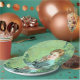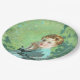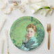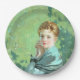 Dieses Design zeigt ein Gemälde des schottischen Künstlers George Henry (1858-1943), der eines der prominentesten Mitglieder der Glasgow School of Art war. Es ist ein Portrait einer schönen jungen Frau namens Felicity. Sie sitzt an einem Tisch und trägt ein türkisblau-blaues Kleid. Ihre Ellbogen ruhen auf dem Tisch und halten ihre Hände neben ihrem Gesicht fest. Die Felicity beginnt intensiv beim Betrachter. Sie ist eindeutig eine elegante Frau. Ihr kastanienbraunes Haar ist modern gestylt und trägt einen Schal über ihrem Kleid, das ein etwas dunklerer türkisfarbener ist als das Kleid selbst. Im Hintergrund ist die Vegetation, was darauf hindeutet, dass sie draußen in einem Garten sitzt. Das Originalwerk wurde 1916 von George Henry gemalt.