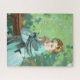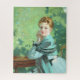 Dieses Design zeigt ein Gemälde des schottischen Künstlers George Henry (1858-1943), der eines der prominentesten Mitglieder der Glasgow School of Art war. Es ist ein Portrait einer schönen jungen Frau namens Felicity. Sie sitzt an einem Tisch und trägt ein türkisblau-blaues Kleid. Ihre Ellbogen ruhen auf dem Tisch und halten ihre Hände neben ihrem Gesicht fest. Die Felicity beginnt intensiv beim Betrachter. Sie ist eindeutig eine elegante Frau. Ihr kastanienbraunes Haar ist modern gestylt und trägt einen Schal über ihrem Kleid, das ein etwas dunklerer türkisfarbener ist als das Kleid selbst. Im Hintergrund ist die Vegetation, was darauf hindeutet, dass sie draußen in einem Garten sitzt. Das Originalwerk wurde 1916 von George Henry gemalt.
