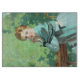 Dieses Design zeigt ein Gemälde des schottischen Künstlers George Henry (1858-1943), der eines der prominentesten Mitglieder der Glasgow School of Art war. Es ist ein Portrait einer schönen jungen Frau namens Felicity. Sie sitzt an einem Tisch und trägt ein türkisblau-blaues Kleid. Ihre Ellbogen ruhen auf dem Tisch und halten ihre Hände neben ihrem Gesicht fest. Die Felicity beginnt intensiv beim Betrachter. Sie ist eindeutig eine elegante Frau. Ihr kastanienbraunes Haar ist modern gestylt und trägt einen Schal über ihrem Kleid, das ein etwas dunklerer türkisfarbener ist als das Kleid selbst. Im Hintergrund ist die Vegetation, was darauf hindeutet, dass sie draußen in einem Garten sitzt. Das Originalwerk wurde 1916 von George Henry gemalt.