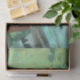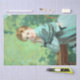 Dieses Design zeigt ein Gemälde des schottischen Künstlers George Henry (1858-1943), der eines der prominentesten Mitglieder der Glasgow School of Art war. Es ist ein Portrait einer schönen jungen Frau namens Felicity. Sie sitzt an einem Tisch und trägt ein türkisblau-blaues Kleid. Ihre Ellbogen ruhen auf dem Tisch und halten ihre Hände neben ihrem Gesicht fest. Die Felicity beginnt intensiv beim Betrachter. Sie ist eindeutig eine elegante Frau. Ihr kastanienbraunes Haar ist modern gestylt und trägt einen Schal über ihrem Kleid, das ein etwas dunklerer türkisfarbener ist als das Kleid selbst. Im Hintergrund ist die Vegetation, was darauf hindeutet, dass sie draußen in einem Garten sitzt. Das Originalwerk wurde 1916 von George Henry gemalt.