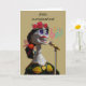 Feliz Cumpleanos Geburtstagskarte mit einer Papierkeilfigur auf einem Mikrofon, die eine Skelettfigur auf Papier macht. Sie ist mit rote Rosen geschmückt, einem marigalten Band und Bogen und goldfarbenem Kleid. Viele glückliche Rückgaben in Spanisch in der Karte geschrieben. Art, Bild und Vers Copyright © Shoaff Ballanger Studios, 2022.