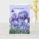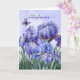 Lila, bärtige Iris-Blume in Violett- und Lavendeltönen werden von hübschen Schmetterlingen in einer Gartenlandschaft genossen, die dann mit einer schönen Geburtstagsbotschaft in spanischer Sprache gepaart werden. Mögen Sie alles bekommen, was Sie an diesem besonderen Tag wünschen, ist die Nachricht.
